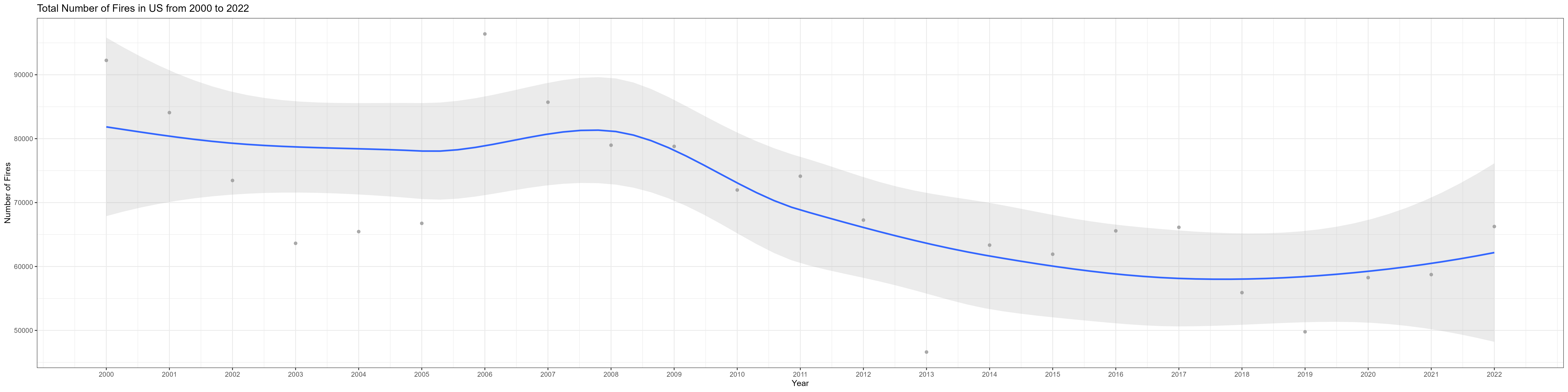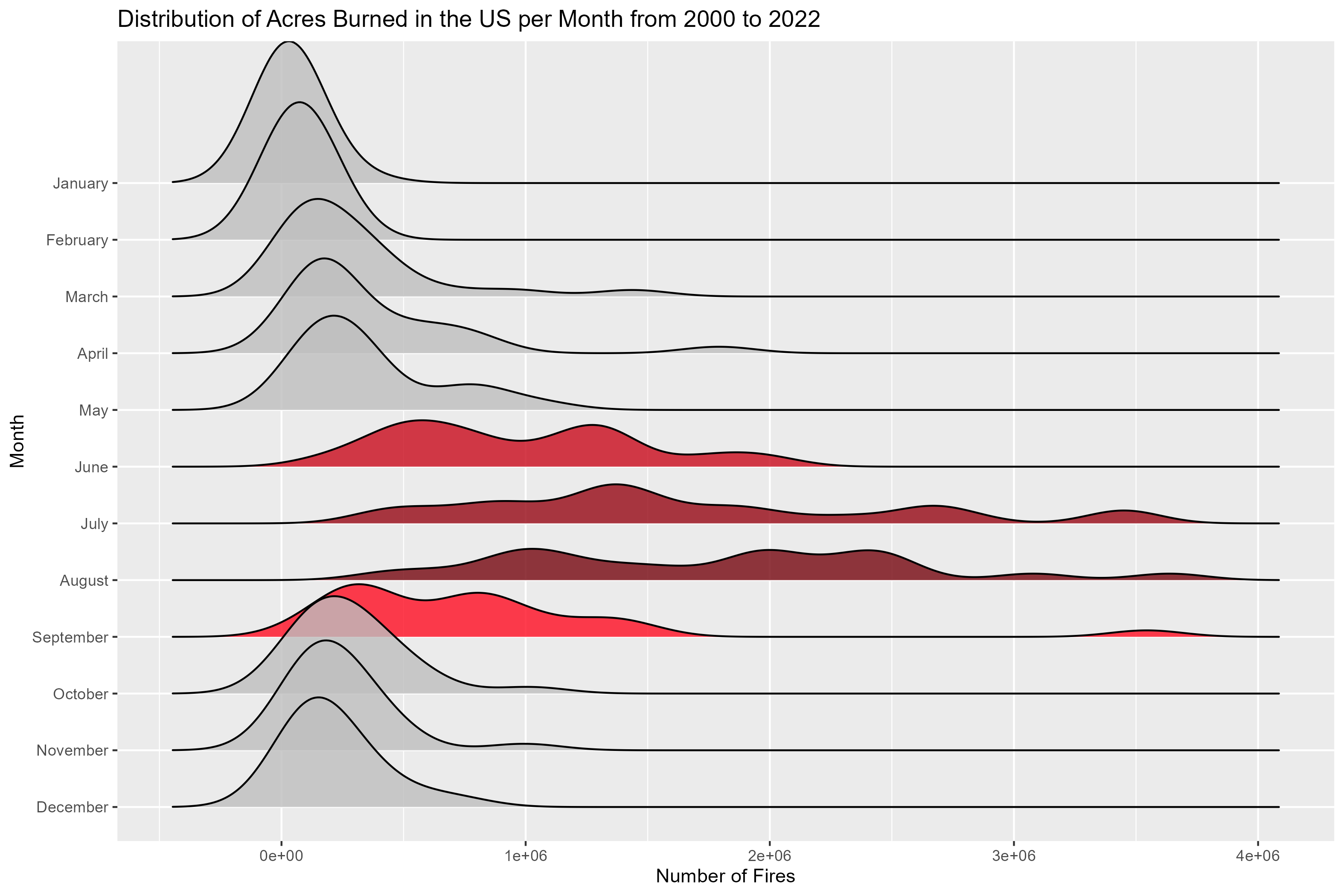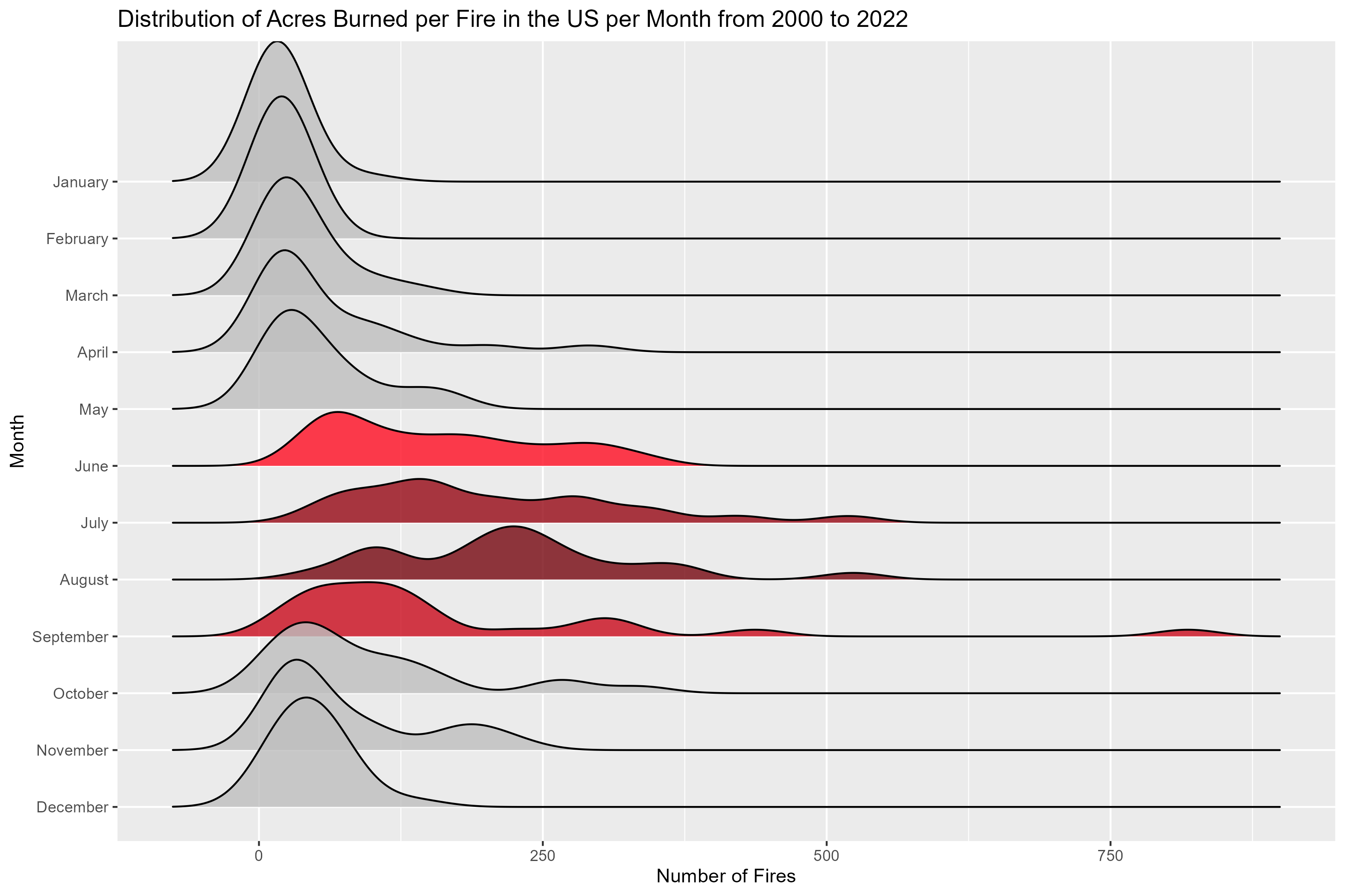 The above plots demonstrate more into the trend of acres burned and number of fires in there total values as apposed to the spread as demonstrate in the density ridge plots. How these scatter plots were made was that each year the variables values were summed up over the months to show what the total number of the variable (acres burned or number of fires respectively) for that year. As one can see, there is a noticeable increase in ‘Acres Burned’ from 2000 to 2022 but a decrease in the ‘Number of Fires’. This leads to an observation that even though the number of fires have decreased over the past two decades, the severity of each of these fires has increased. So much so that the smaller number of fires is producing more burned area than the larger number of fires in total. This can be quite alarming as it reflects on the “out of control” nature that fires can have. Further understanding might help with protecting people and the environment in the US from these wildfires that are burning more and more than previously.