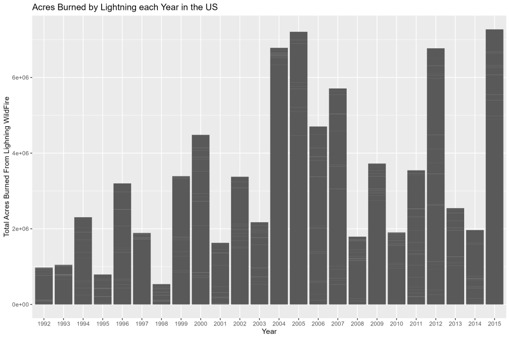 Acres Burned from Fires started by Lightning in the US 1992 to 2015