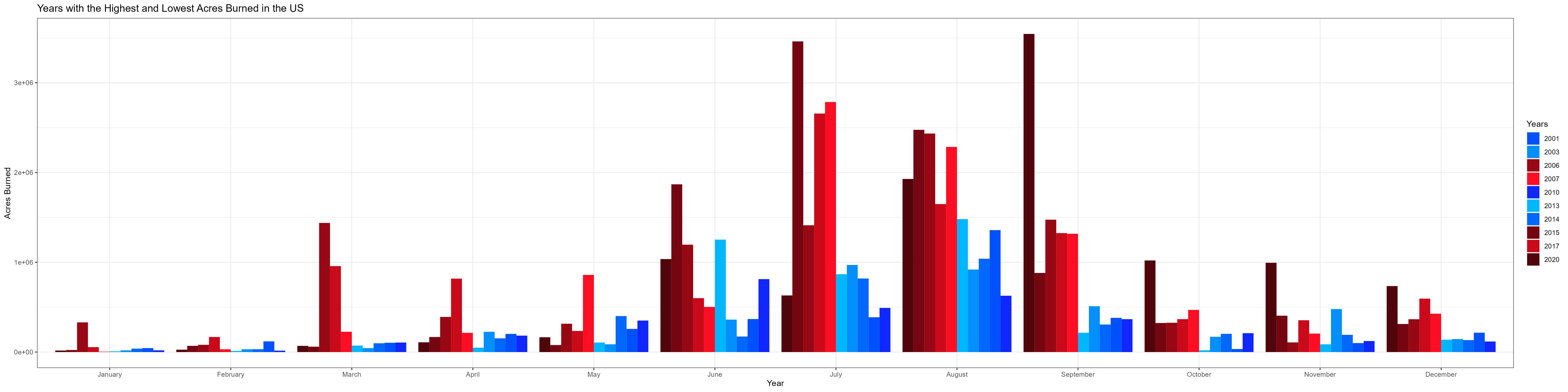 Darkest Red to Darkest Blue – Highest 5 Years for Acres Burned in red and Lowest 5 Years for Acres Burned in blue. The purpose of this plot is showing which how these two extremes differ in there distributions over the span of the year. 2020 holds the highest amount of acres burned between the year 2000 and 2022 in the US, one can see that a significant amount of this space happened in the months July through September. It is also important to note that September 2020 was significantly larger than the next highest burn year’s of 2015, but that the July 2015 had significantly more acres burned than July 2020. It is even worth mentioning that three of the bottom 5 have higher acres burned in July compared to the year 2020’s July.
