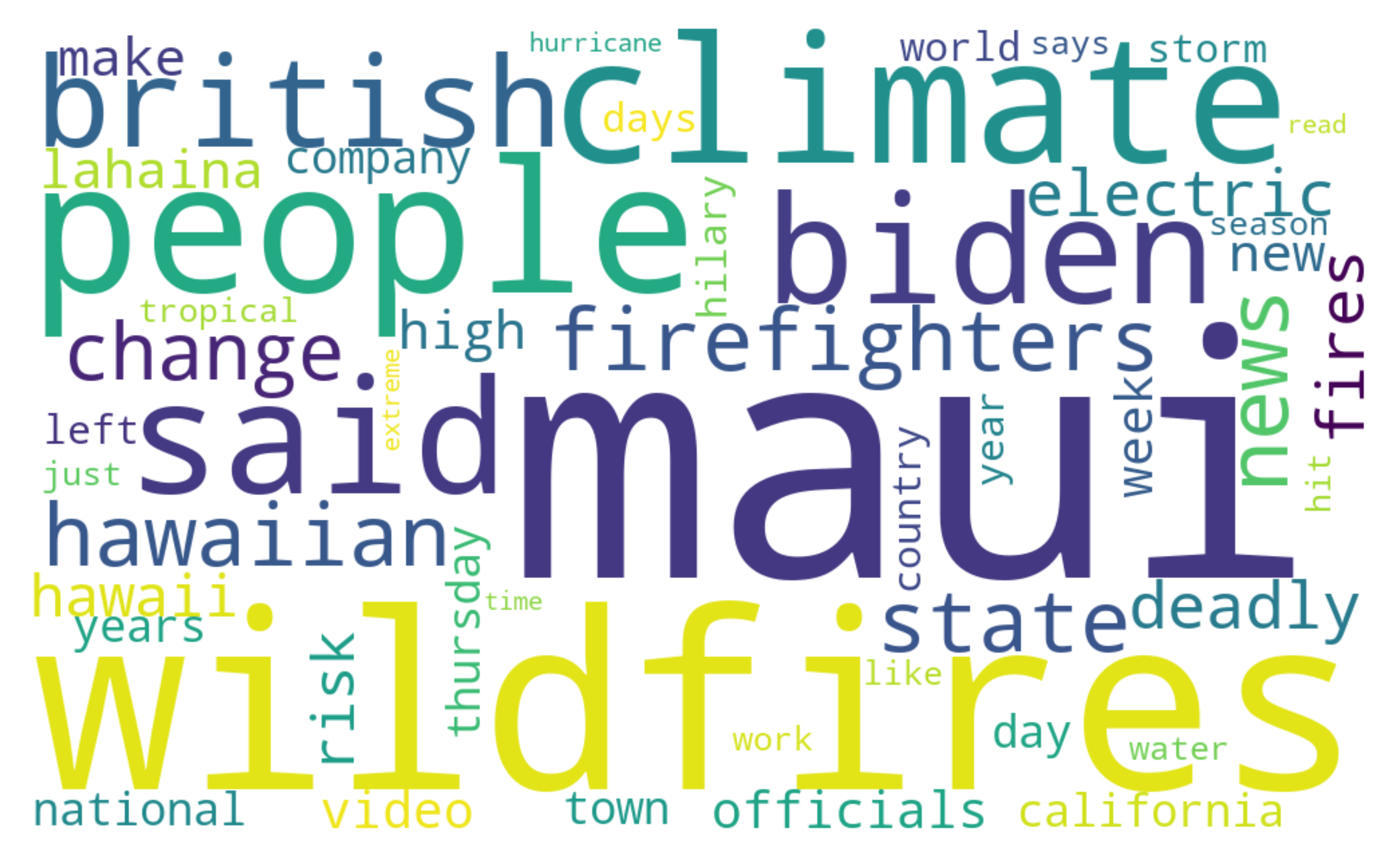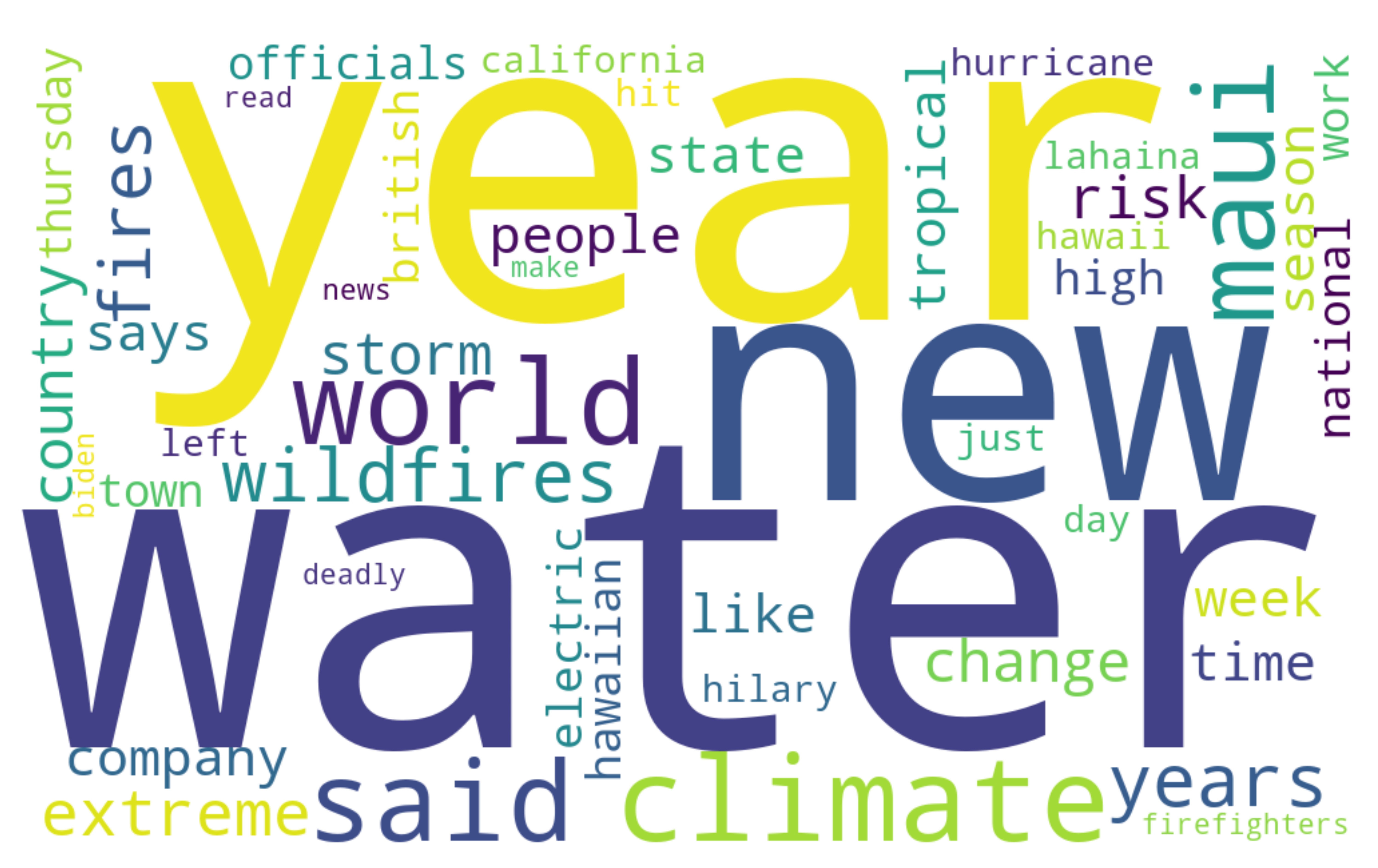 The above images are two of the topics that were chosen to inspect the gathered new article headlines. These and the other word cloud offer visually intuitive way to distill and comprehend key themes and trends of the textual data surrounding the topics of wildfires and drought. At a quick glance one is able to interpret the massive amount of discussion that has focused around Maui, water, different political officials, and the discussion of timeline with use of the word “year” and “years”. Based on this exploratory analysis of the New API data, it is wise to look further into the relationships between wildfires, drought, water, locations, and timelines.