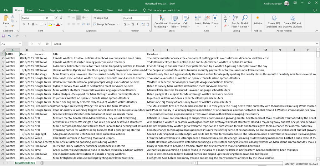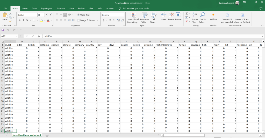 Vectorized data for all the topics (“wildfire”, “fire”, “drought”, “burn”, “weather”). This is designed to show the frequency of specific words mentioned in the articles and is now saved as a csv.
