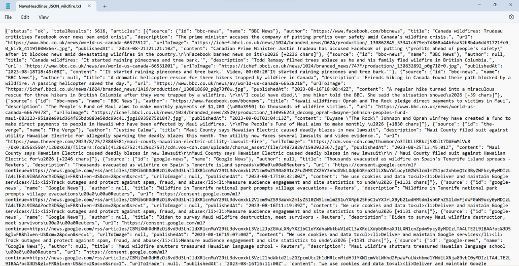 One of the first data sources that was accessed for this project was an API for news article headings. Utilizing a news API is a powerful way to stay updated with real-time information from a wide range of sources. By integrating a news API into this project the information can stay relevant and therefore create stronger findings. As seen in the Exploratory Data Analysis section of this page, this API shows some of the social focus on the Maui fire that has been devastating for the locals and environment. This APIs has been used by filtering content by topics. These are not limited by the ones currently selected. This said, the topics of focus are: wildfire, fire, drought, burn, and weather.