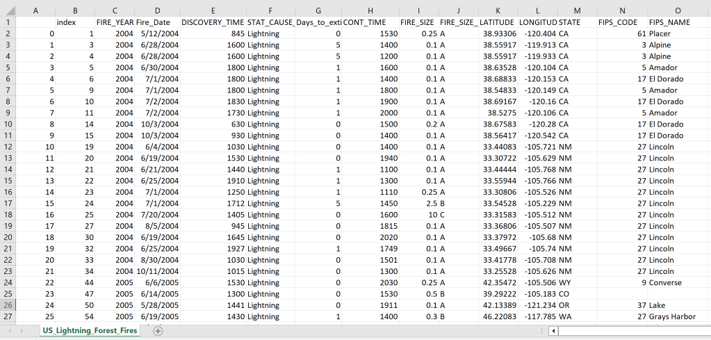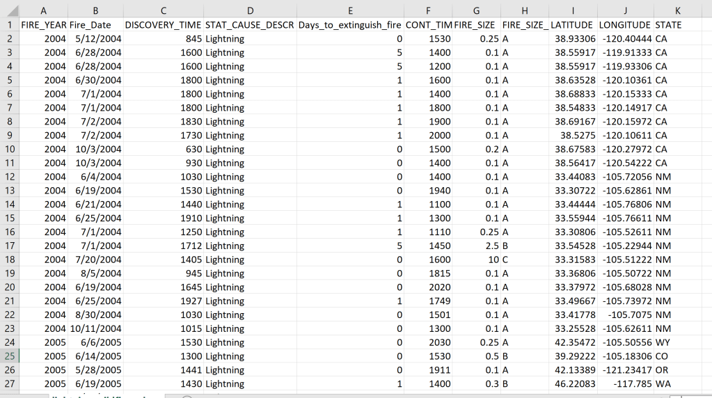 This dataset is a mostly cleaned csv file that was pulled from Kaggle. Here is information on wildfires between 1992 and 2015 in the US that were specifically caused by lightning. Lightning is a well known cause of fires, and is an unpreventable weather pattern. research into lightning and the resulting fires may lead to safe practices in the future.