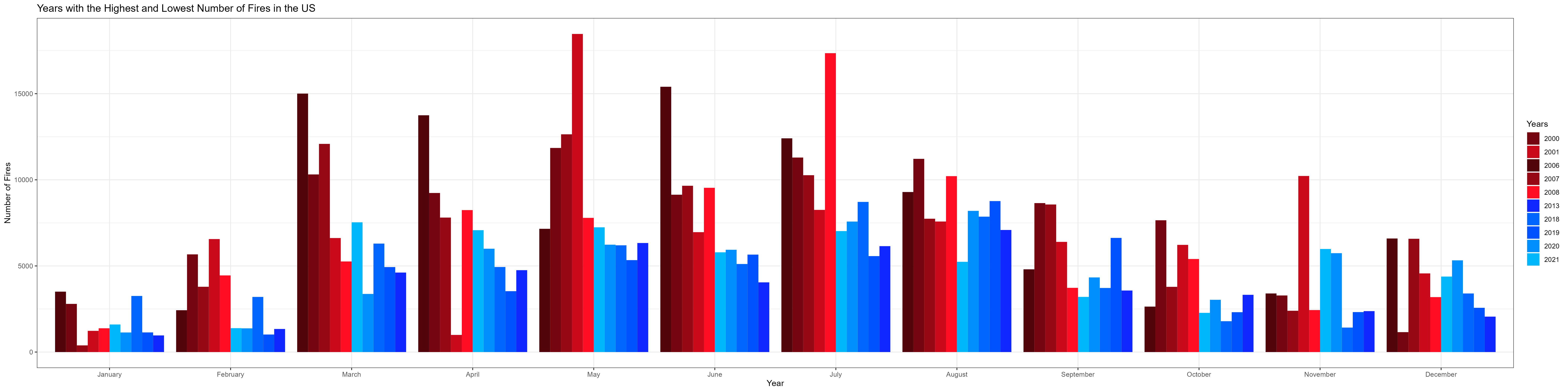Here one can see that the 5 highest number of fires and 5 lowest are not the same years as for the acres burned. As noted above 2020 had the most acres burned in the last two decades, but here we see that 2020 is one of the lowest – the fourth lowest. Which means that the fires in 2020 may have be low in the number of fires, but as seen in the first plot months such as August and September are severe per fire. Another point to observe is that for the number of fires, it stays fairly consistent in the 5 lowest being noticeably lower than the the five highest (except for January and November). This plot stays consistent with the trends seen in the boxplot “Number of Fires Each Month for the year 2000 to 2022” as described above, where the number of fires increase in March and then stays somewhat steady in summer then decreases in the fall and winter.