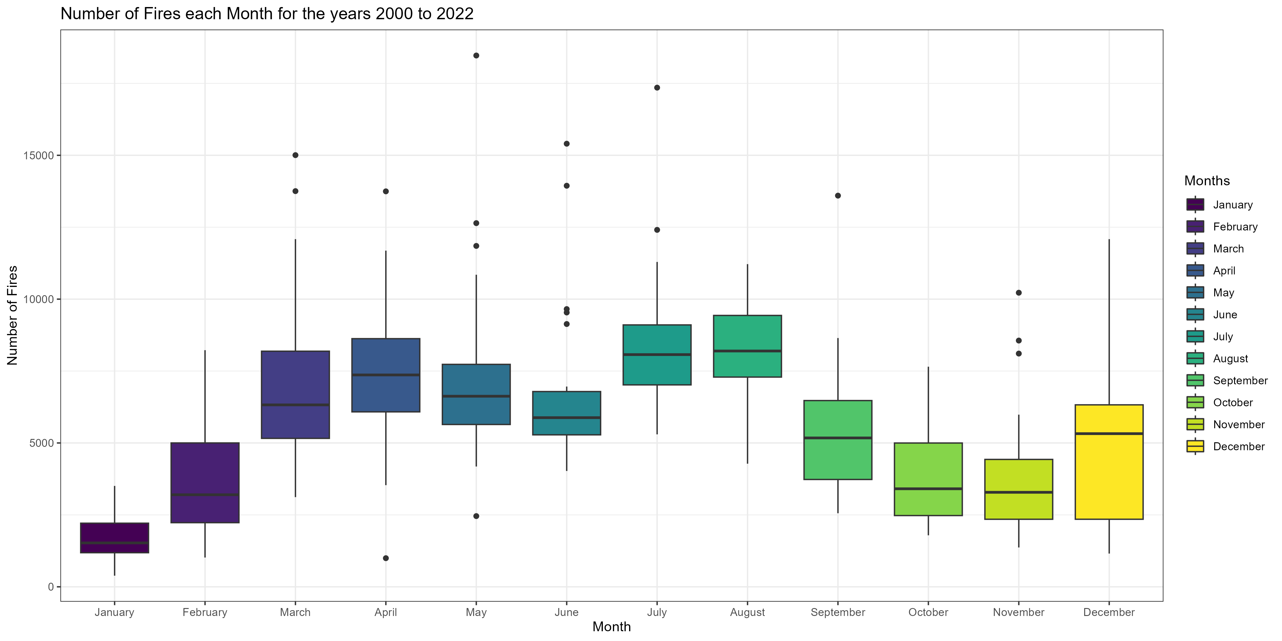 Another noteworthy observation is the number of fires is a little more consistent between months, but still has a significant increase in its center and spread in the months highlighted in red. For the number of fires, the darkest blue and the darkest red demonstrate the extreme ends of the number of fires. So January has a history of having less total fires throughout the past two decades and July has the most. It is interesting to note that that January and February have the least amount of fires and the it jumps up in March and the starts to slow down in October. Also within the distributions of the number of fires one can see that there is a lot of variation in December. This is interesting because for the acres burned variables the colder months have fairly normal distributions and gain more and more of a skew as the months change to summer. Yet, for fall into winter months, one can still see lots of variation in the number of fires. Further research can give a better understanding of why this may be. This same observation can be seen in the boxplot below.