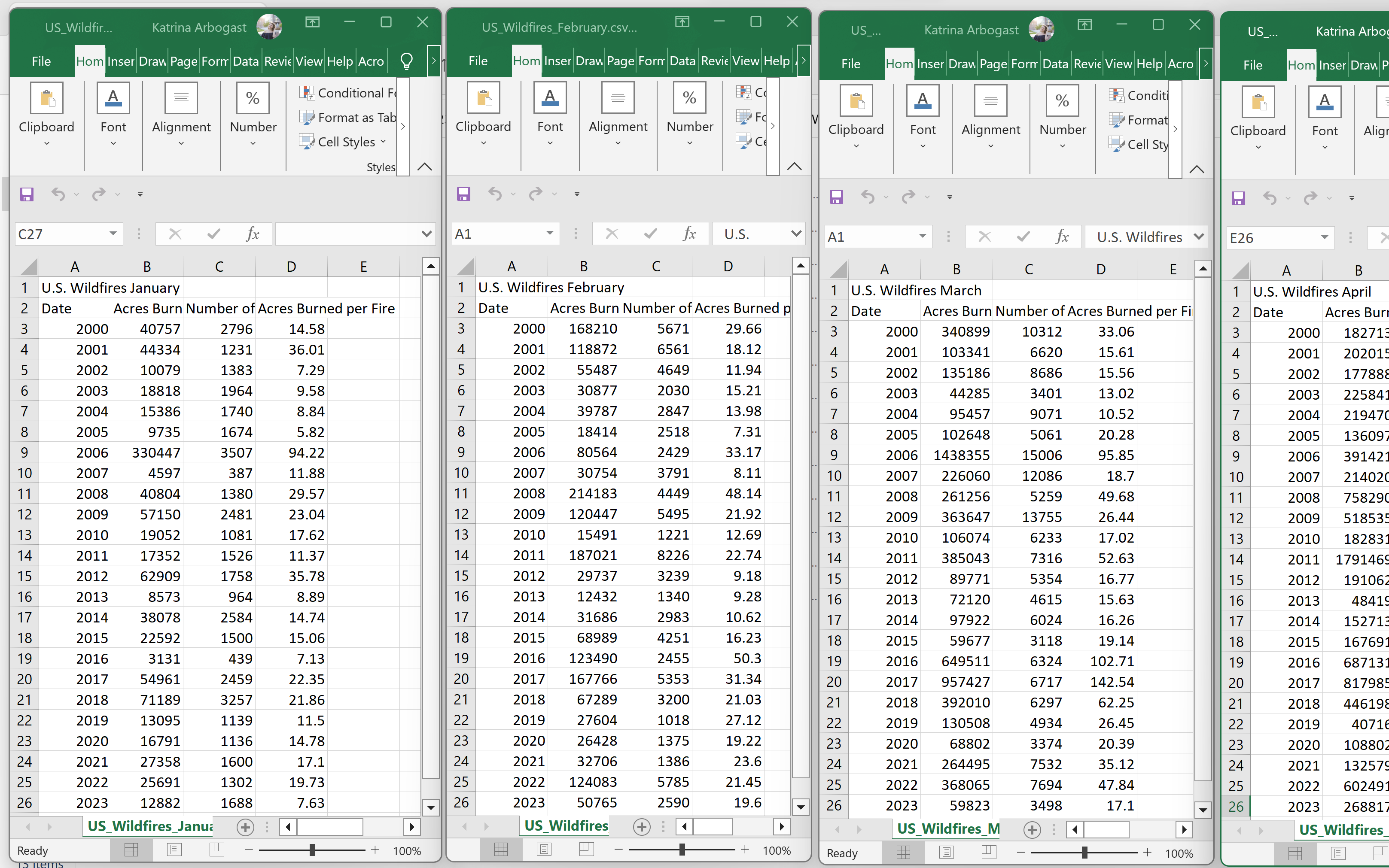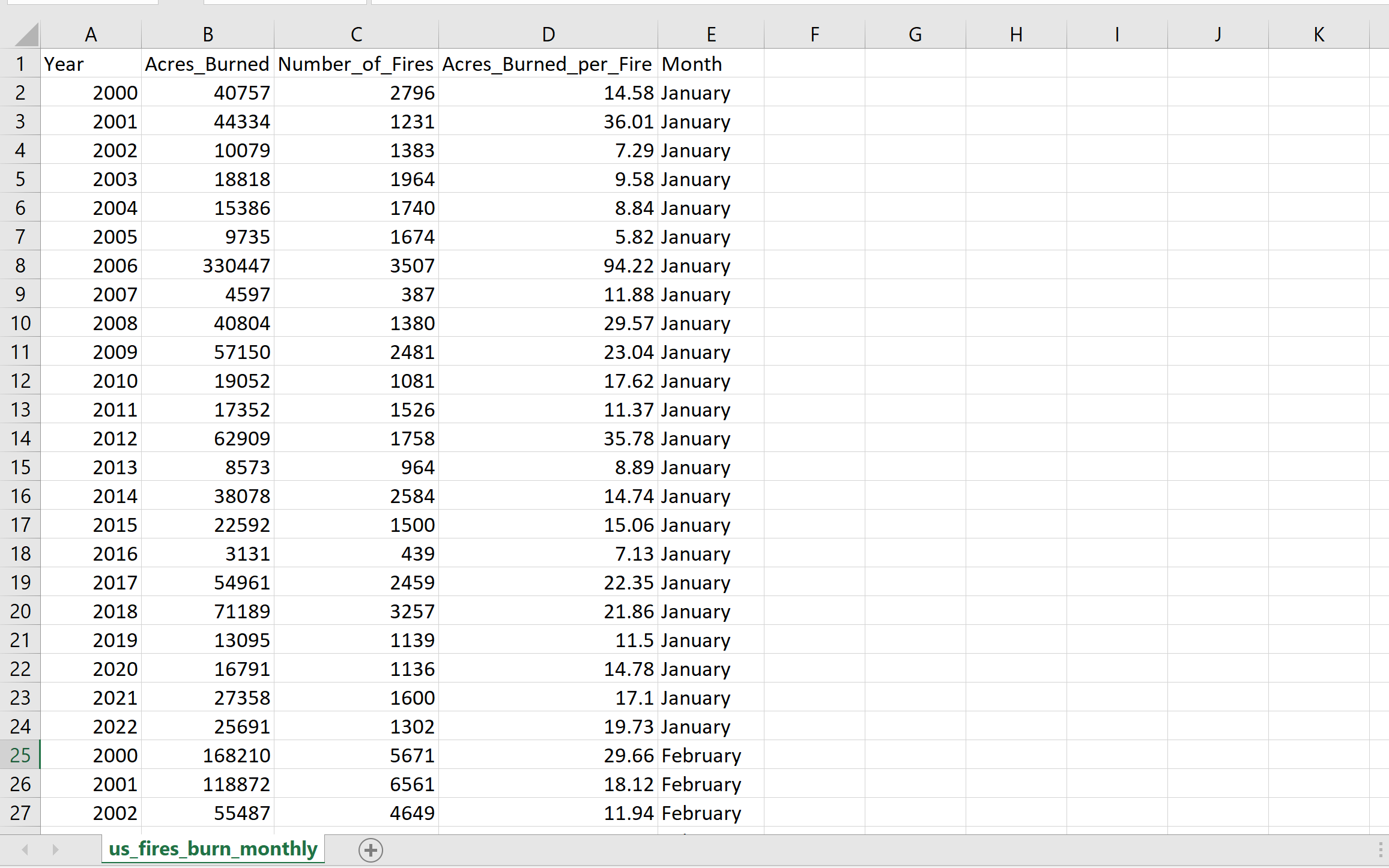 Another data source used for this project is the monthly statistics of wildfire burn areas in the year 2000 to 2023. This data was provided as a downloadable csv for a particular month in the above time range providing summary values of ‘Acres Burned’, ‘Acres Burned per Fire’, and ‘Number of Fires’. Some cleaning was carried out so that the data would be condensed to one csv containing all of the information for all of the months. This process also included assigning the appropriate data types to the columns. Another level to this was removing the rows for the year 2023. As project is being held in the year 2023, the data is therefore incomplete. Future analyses are encouraged.
