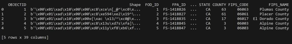 Table including wildfire data for the period of 1992-2020 compiled from US federal, state, and local reporting systems. The following core data elements were required for records to be included in this data publication: discovery date, final fire size, and a point location. This dataset spans many year in high detail and therefore the file is quite massive. The code for how this data is provided in the GitHub repository, however, only the cleaned and narrowed down data is given as the raw was unable to be supported by GitHub. The raw data can be found at the kaggle link above.