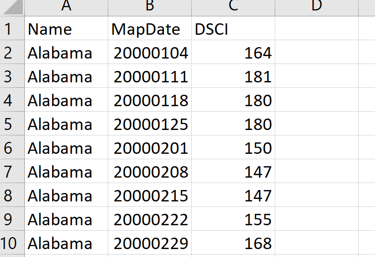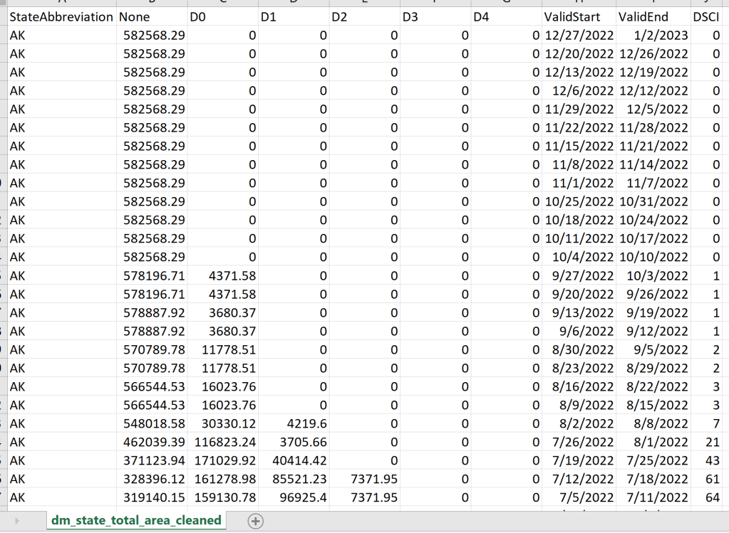 This data has either the total number of acres affected by the drought category per state on that date, or the percentage of the states area that is affected by that drought category.