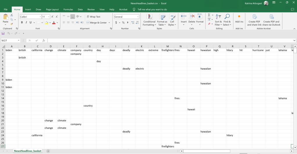Taking the vectorized data from above, we replaced the 0’s with empty strings and the counted values with the columns words. This gives a beginning to basket data that can be used for ARM
