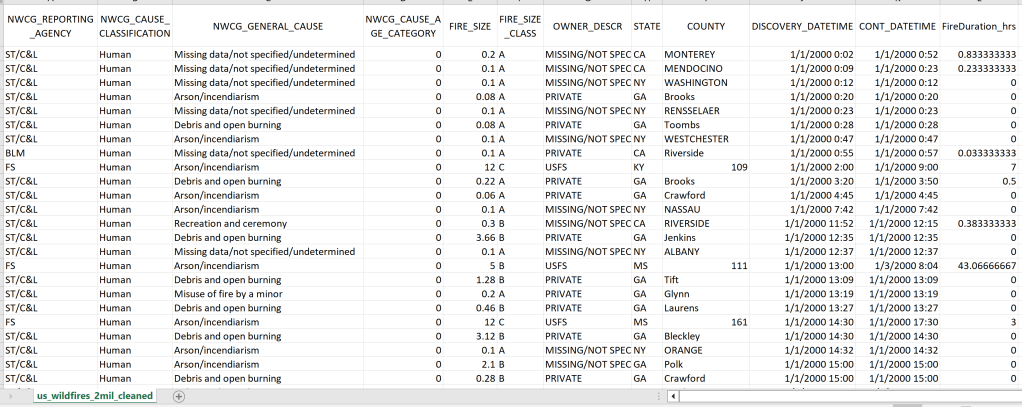 Dropped columns that were not desired in the further analyses or if they had too many NA values. Selected years 2000 to 2020. Fixed columns data types, and reduced categorical values to integer values to reduce memory. Removed rows with NA values. Added a fire duration column based on the date time of Discovery and the Containment times.