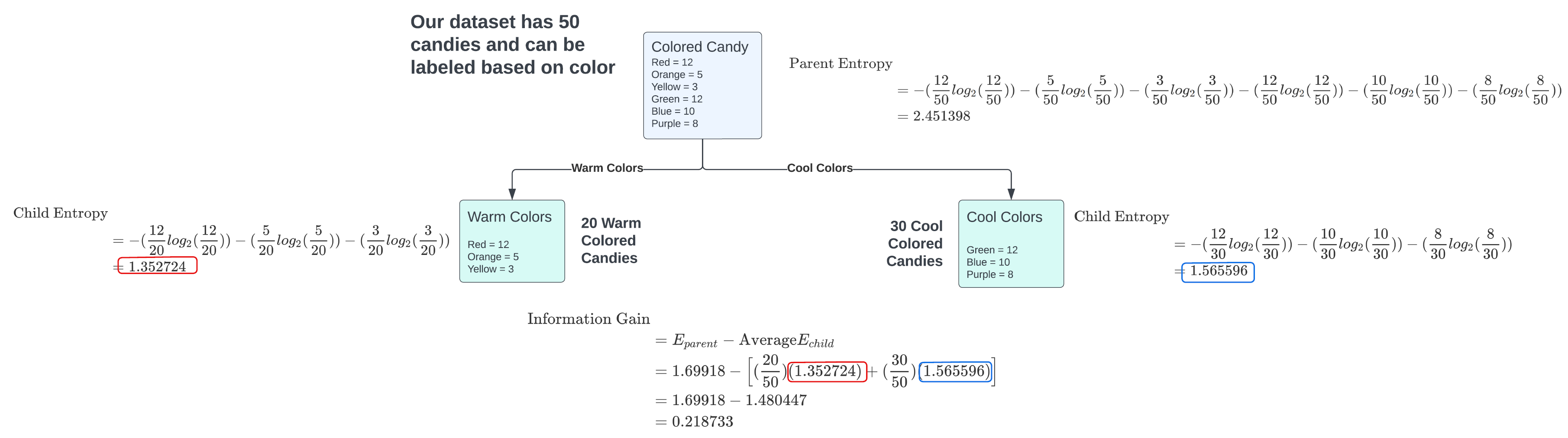 For the split on “warm colors” vs “cool colors” the colored candy’s decision tree split had an information gain of 0.218733. One could perform any kind of split on the colored candy’s and by following the same steps above then comparing this new split with the one shown above will show which is a more effective split for the colored candy dataset.