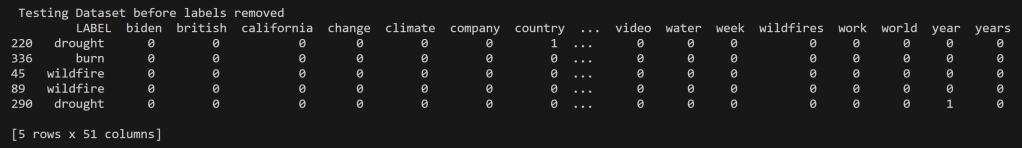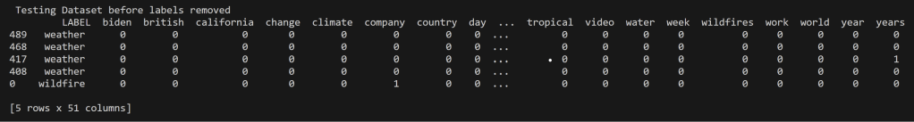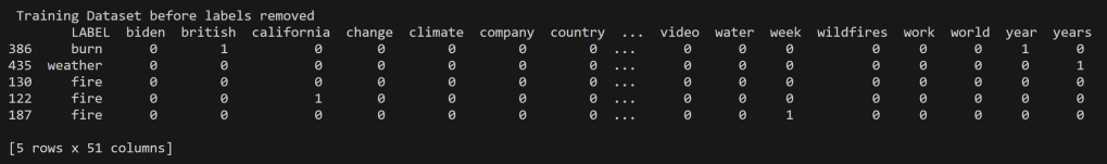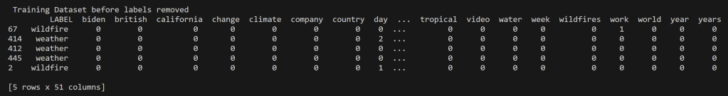 In an effort to address the challenge of dealing with words that have closely related contexts, a decision was made to streamline the topics to “wildfires” and “weather.” This decision aimed to simplify the model and minimize errors in the confusion matrix. The rationale behind this choice stemmed from prior analysis of the data, which revealed that the weather data predominantly centered around the discussion of the Hilary Hurricane in California, while the wildfire data focused on the Maui Fire.