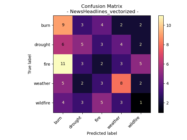 Using Gini Values as the criterion, a decision tree model was constructed for the New Headlines Vectorized Data collected on September 16th, 2023. This dataset produced a notably intricate tree, indicating a high probability of overfitting. The results from the Confusion Matrix and the Accuracy clearly indicate that the model’s performance on the test data was subpar. Ideally, the diagonal squares should have exhibited the highest values, but this was not the case. The topic “fire” was frequently misclassified as “burn” in the headlines. This issue likely stems from the inherent similarity between headlines that pertain to these topics. It’s reasonable to assume that an article discussing a fire would also touch upon subjects that have been burned.