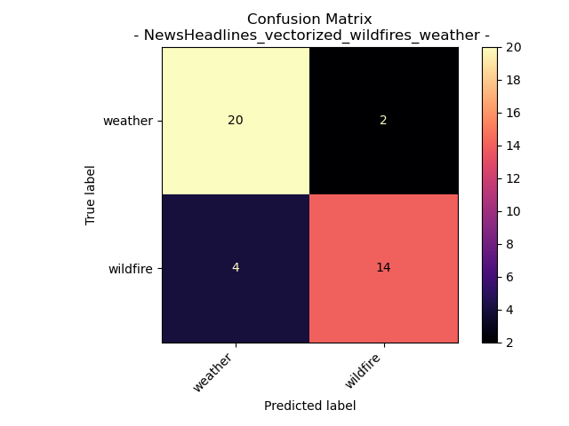 In contrast, the application of decision trees to New Headlines Vectorized Data collected on September 16th, 2023, exhibited a more complex tree structure and an accuracy of only 25%. This model’s poor performance on the test data, as evidenced by the Confusion Matrix, was largely attributed to the overlapping context of words like “wildfire” and “burn” in headlines. This complexity was mitigated by simplifying the model into two primary topics, “wildfire” and “weather,” yielding a significantly improved accuracy of 85% The decision to streamline these topics was motivated by prior data analysis, which revealed a clearer distinction between the two.