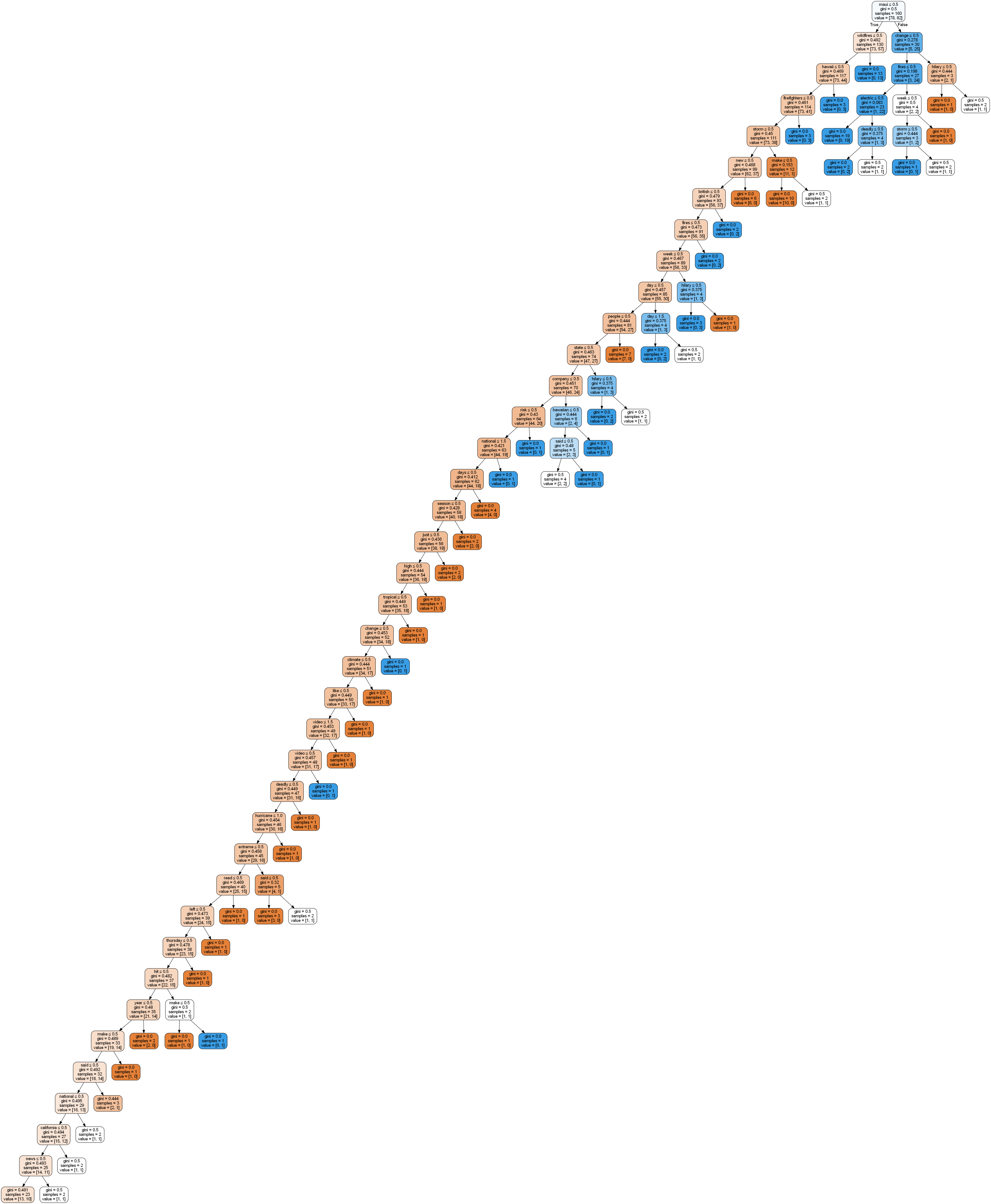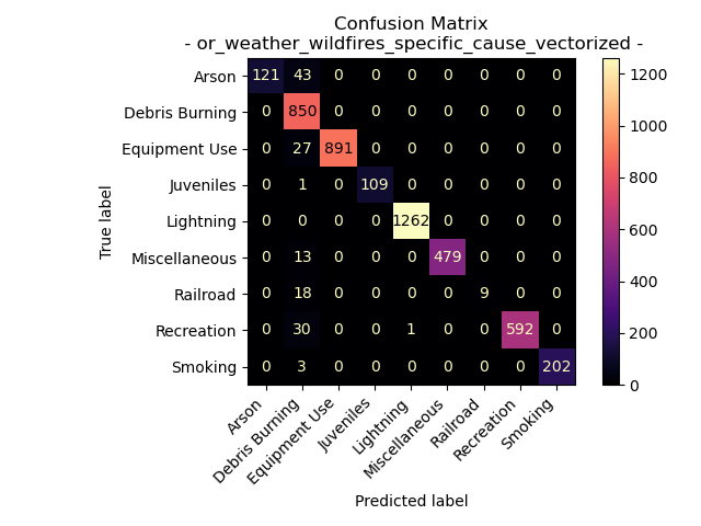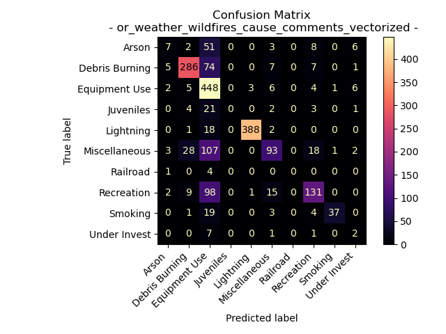 Interestingly the specific cause comment data from the Oregon Weather and Wildfire Data created a less complex decision tree (still with a max depth limit of 25) with a more accurate model as seen by the results of the confusion matrix. The labels for the cause comments and the specific comments are the same, but the text data used form each label is different. A possible theory as to why this data creates a better model is that specific cause comments might be more unique to each label, making them more distinct when splitting.