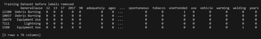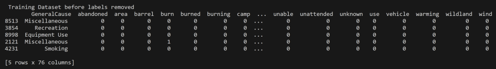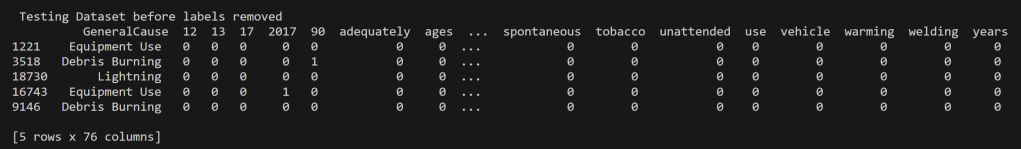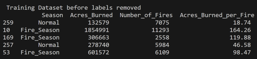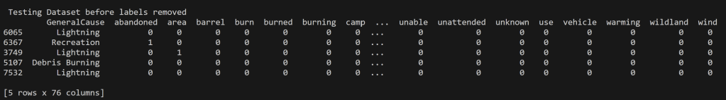 For the analysis of Wildfires in the United States from 2000 to 2022, the decision tree modeling was performed on multiple datasets each with different purposes of them. These include quantitative values for the Acres Burned identifying the time of year the fire took place to that of predicting the topic of an article based on the words used its headline. In order to perform supervised learning appropriately each of the datasets were split into disjoint training and testing datasets with their labels removed (but kept for reference and accuracy analysis). In supervised learning, labels are essential for two primary reasons. They provide the correct output for a given input, allowing the algorithm to learn and make predictions. Labels also enable model evaluation and performance assessment, serving as the basis for key metrics.