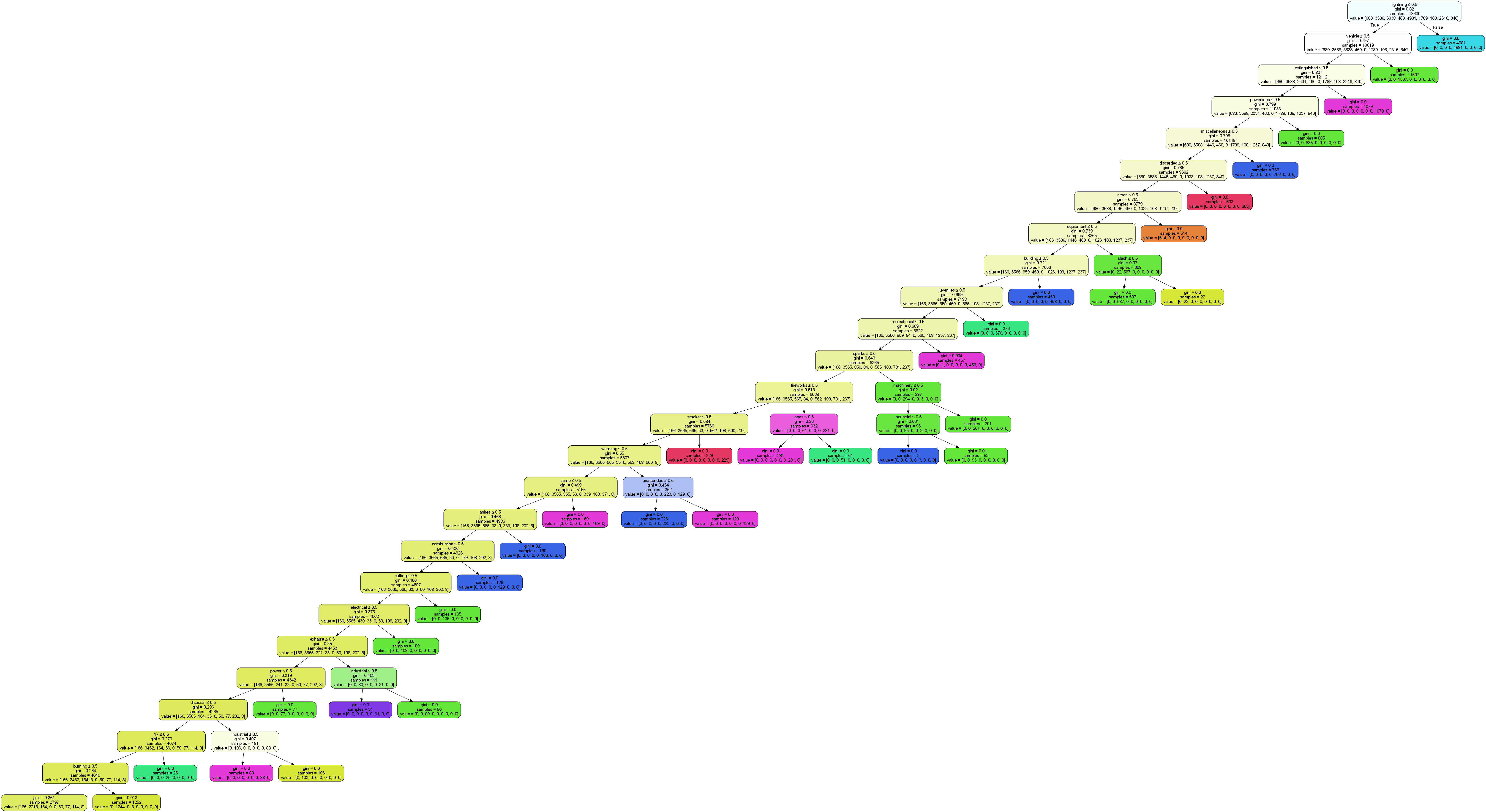 The above decision tree for the modeling of cause comments is extremely complex. It is important to note that this the above decision tree was limited by a maximum depth of 25. Meaning that not all of the terminal nodes are pure. With that in mind from the confusion matrix, the extremely complex model did a less than ideal job of accurately predicting the appropriate label for the test data. Some cause labels wear seen to be predicted well (as noted in the confusion matrix). These include “Debris Burning”, “Equipment Use”, and “Lighting”, but “Railroad” was never accurately predicted.