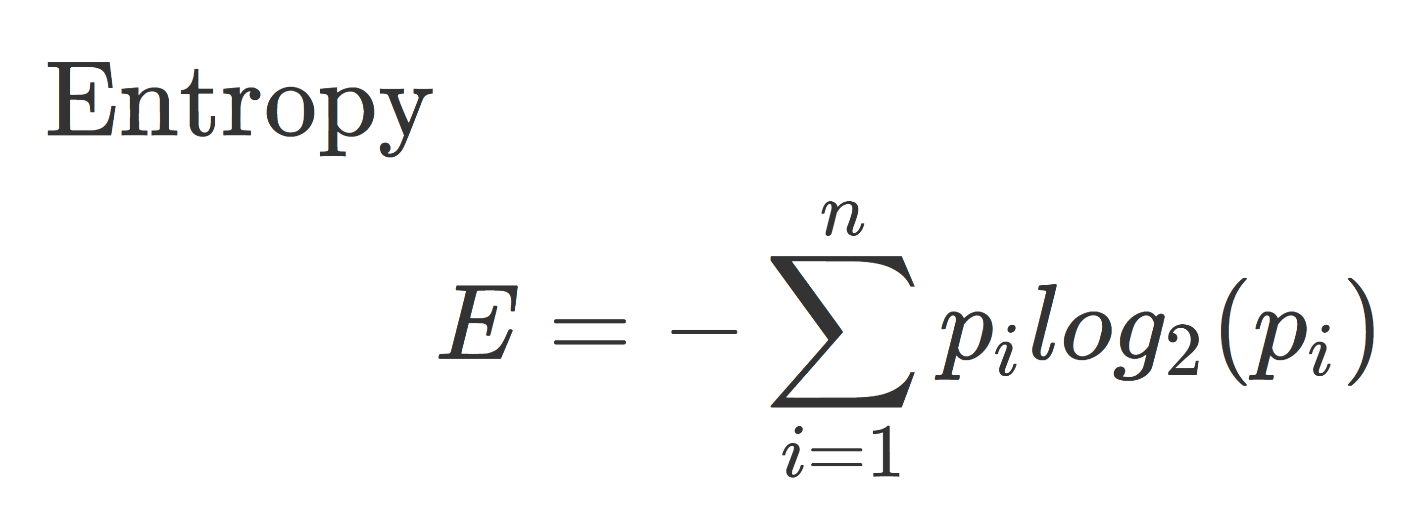 Entropy measures the randomness of the data. “The higher the entropy, the harder it is to draw any conclusions from that information.”4 A “leaf” with higher entropy will have a lower purity, it will still have a mix of values. Pure leaf nodes have entropy of 0, and the entropy for a node where the classes are divided equally would be 1.5 Where p is the probability of randomly selecting data in class i.