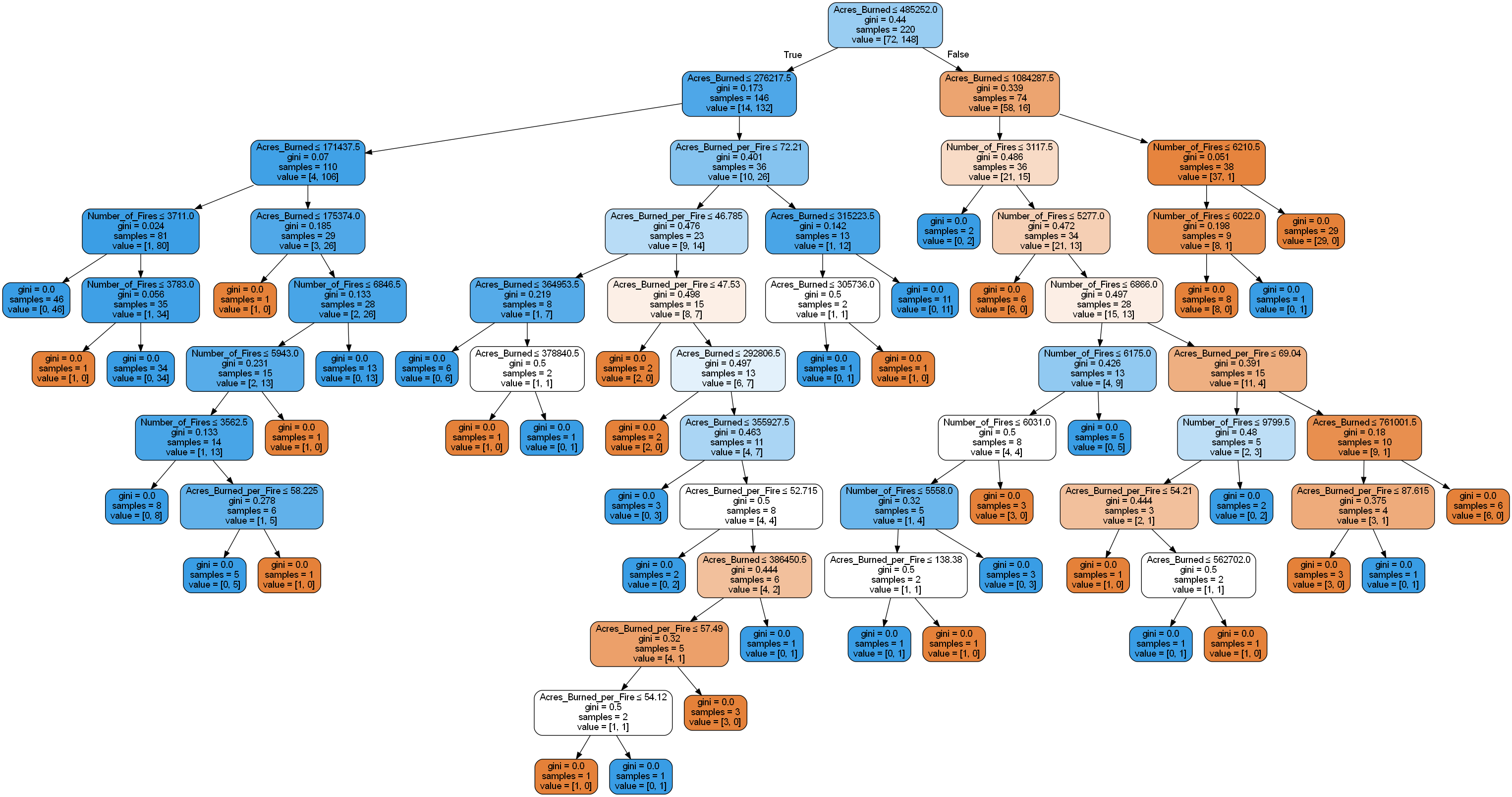 Using Gini as the criterion one can see the results of the US wildfires “fire season” decision tree. This two class problem’s results show that it is indeed possible to model a “Fire Season” compared to “Normal” for the quantitative values associated with fires in the US. This model helps predict if a set of values (“Acres Burned”, “Acres Burned per Fire”, and “Number of Fires”) can be used to predict if the fire occurred in the months June through September.